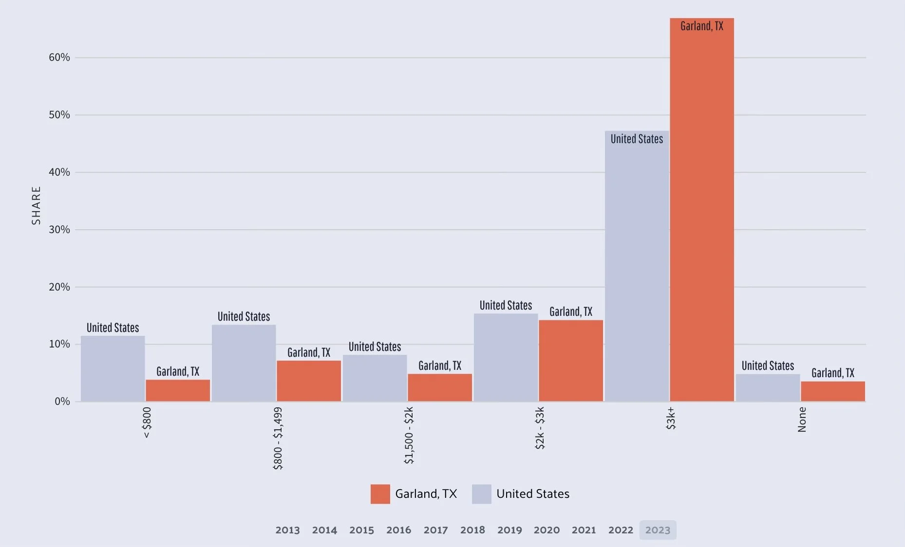 Owner-occupied housing units distributed between a series of property tax buckets compared to the national averages for each bucket. In Garland, TX the largest share of households pay taxes in the $3k+ range.